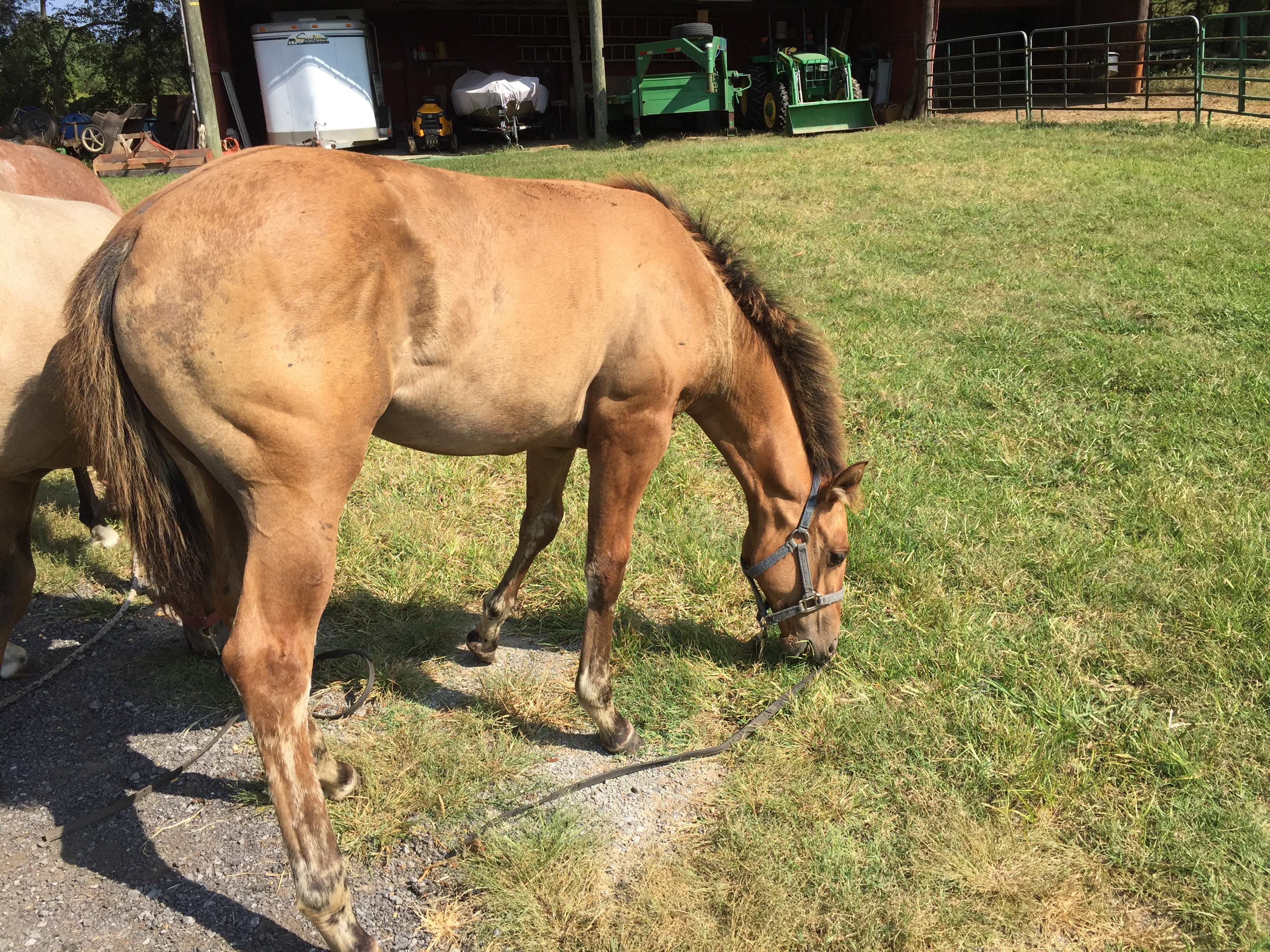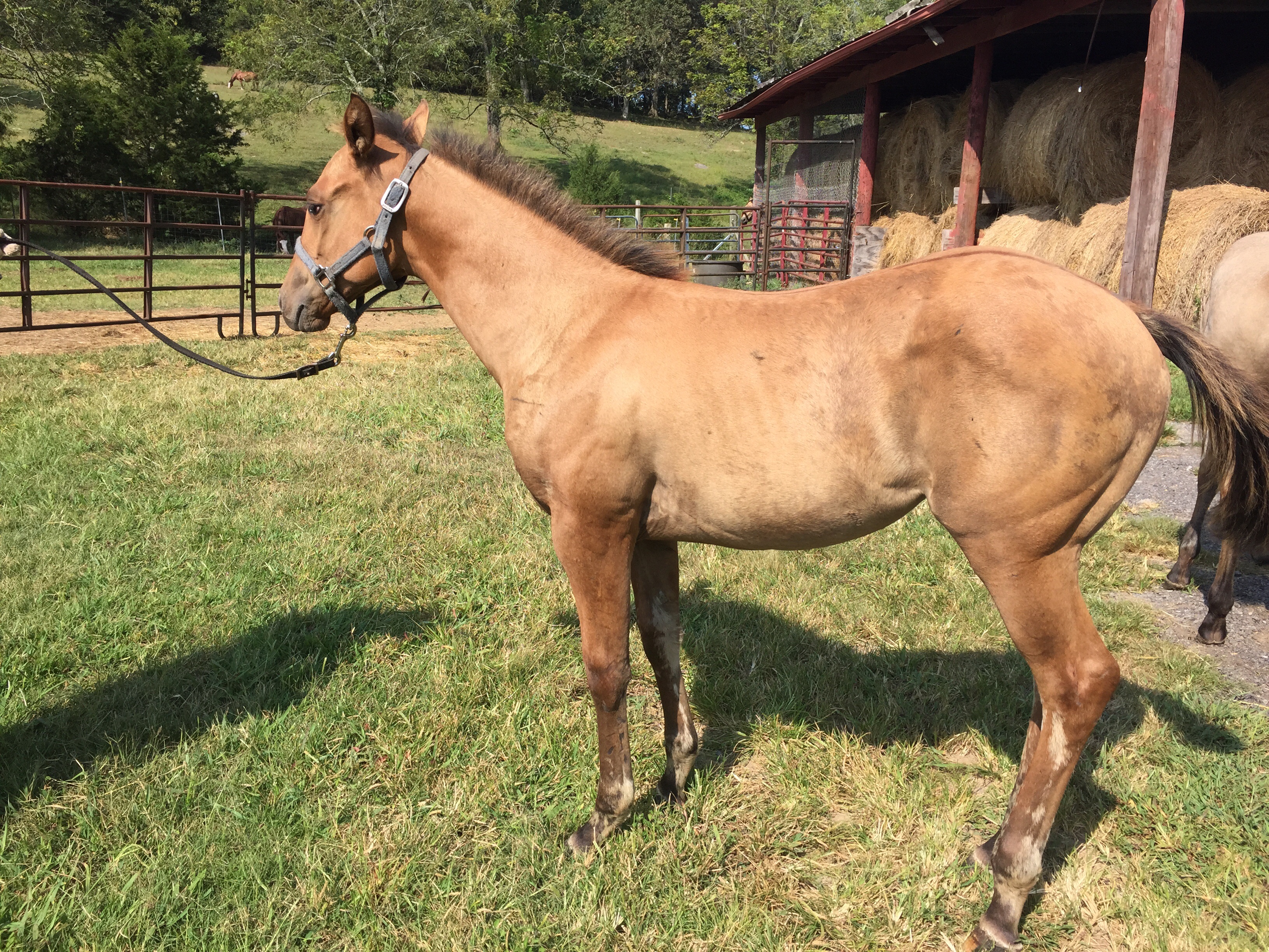 SOLD…..2015 AQHA dun filly weanling. Dun markings. Stout little filly. Stamped well with confirmation. Great mind. Sweet and in your pocket type. Dam was a grulla, 15.3 hands. Pedigree of Okies Turnover, Miss n Okie,Miss n Cash, Dash for Cash on top. Bottom side pretty buck zeb and oh cay quiote. Sells on application so you get to name it. Bonus.