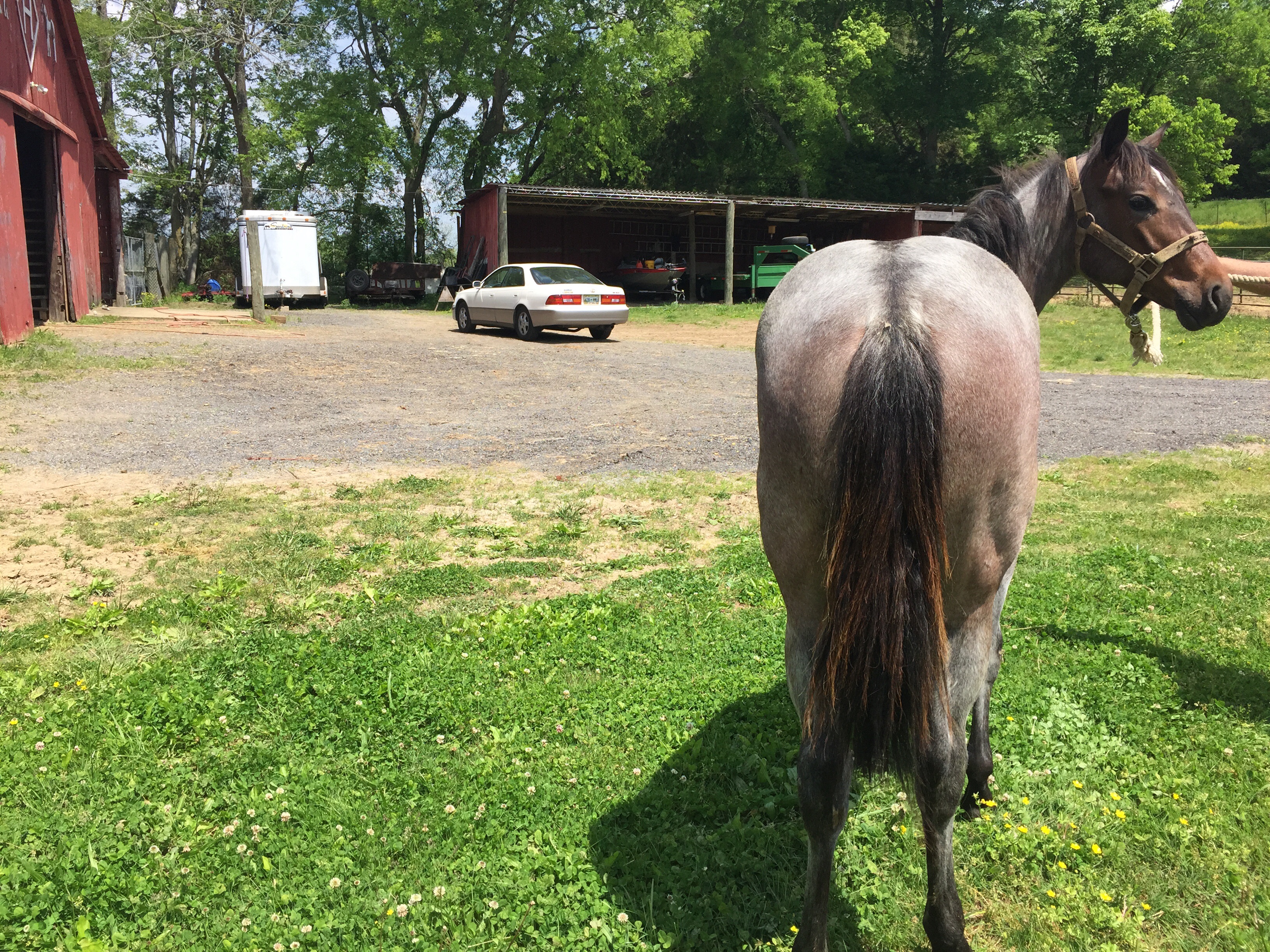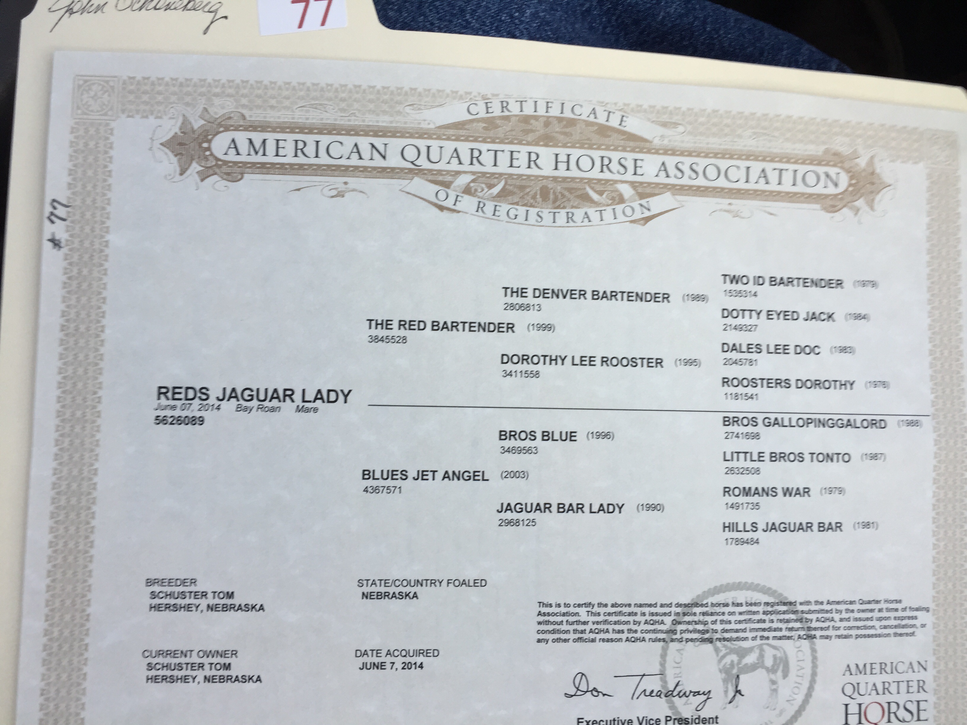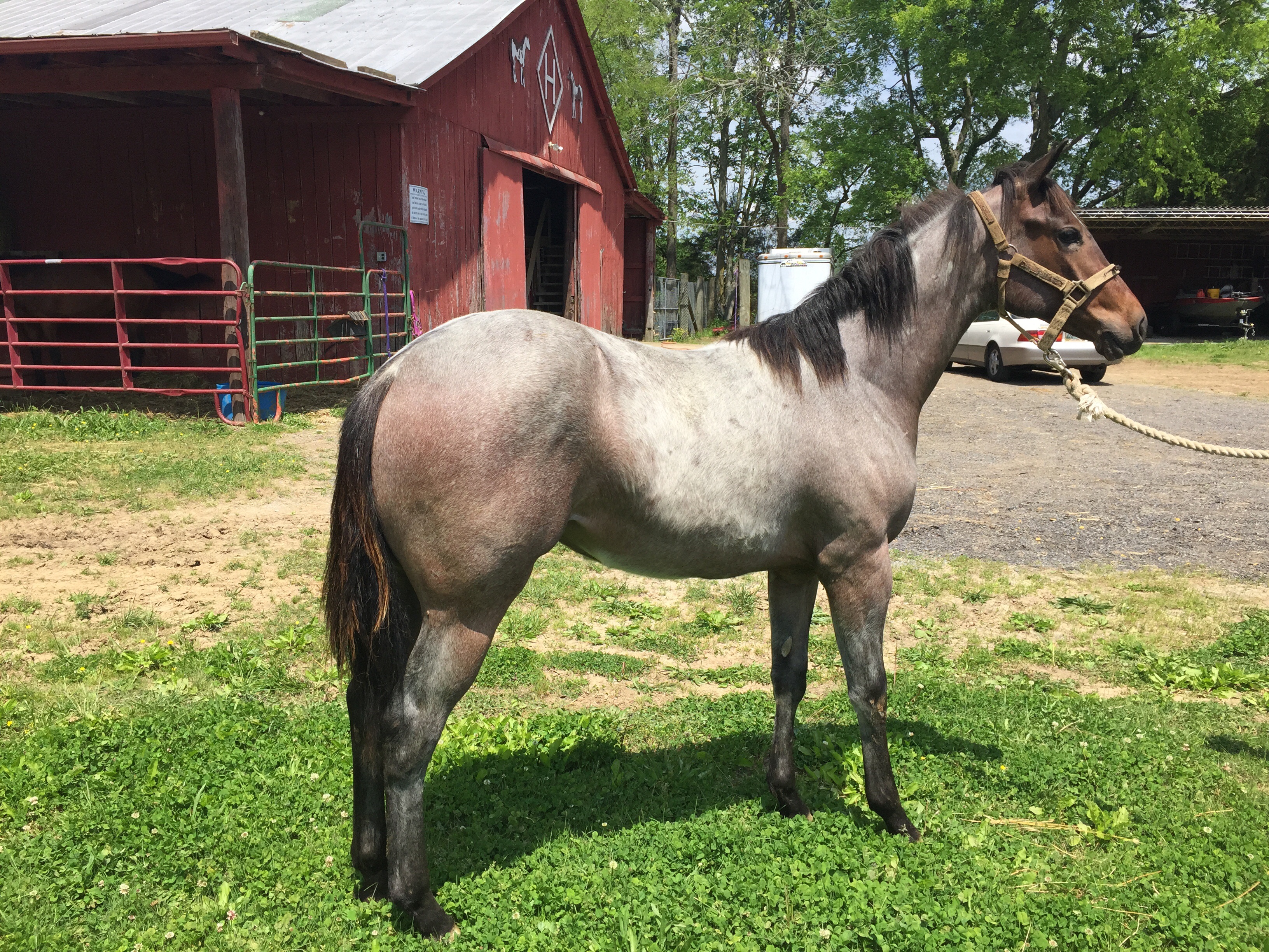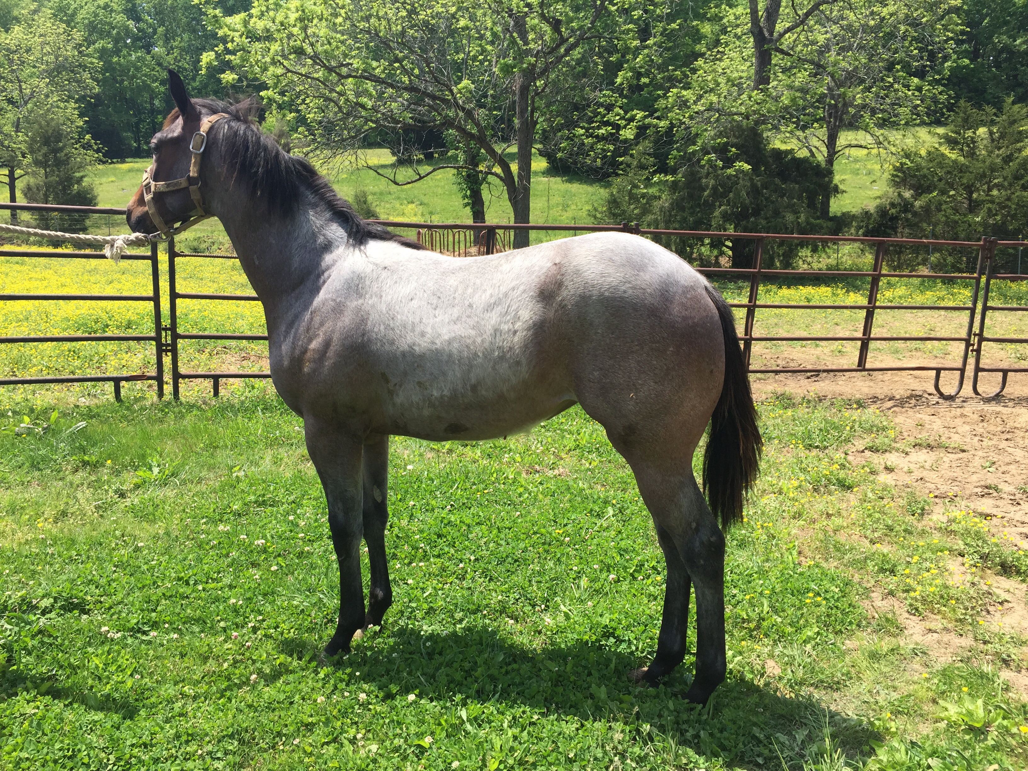 SOLD……….AQHA bay roan filly. Born 6/7/14. Stands 14 hands. Big thick filly with lots of size and shape. Good bone and feet. Gentle and handled. Feet trimmed, wormed, shots and coggins. Pedigree of Two ID Bartender and Bros Blue on bottom.