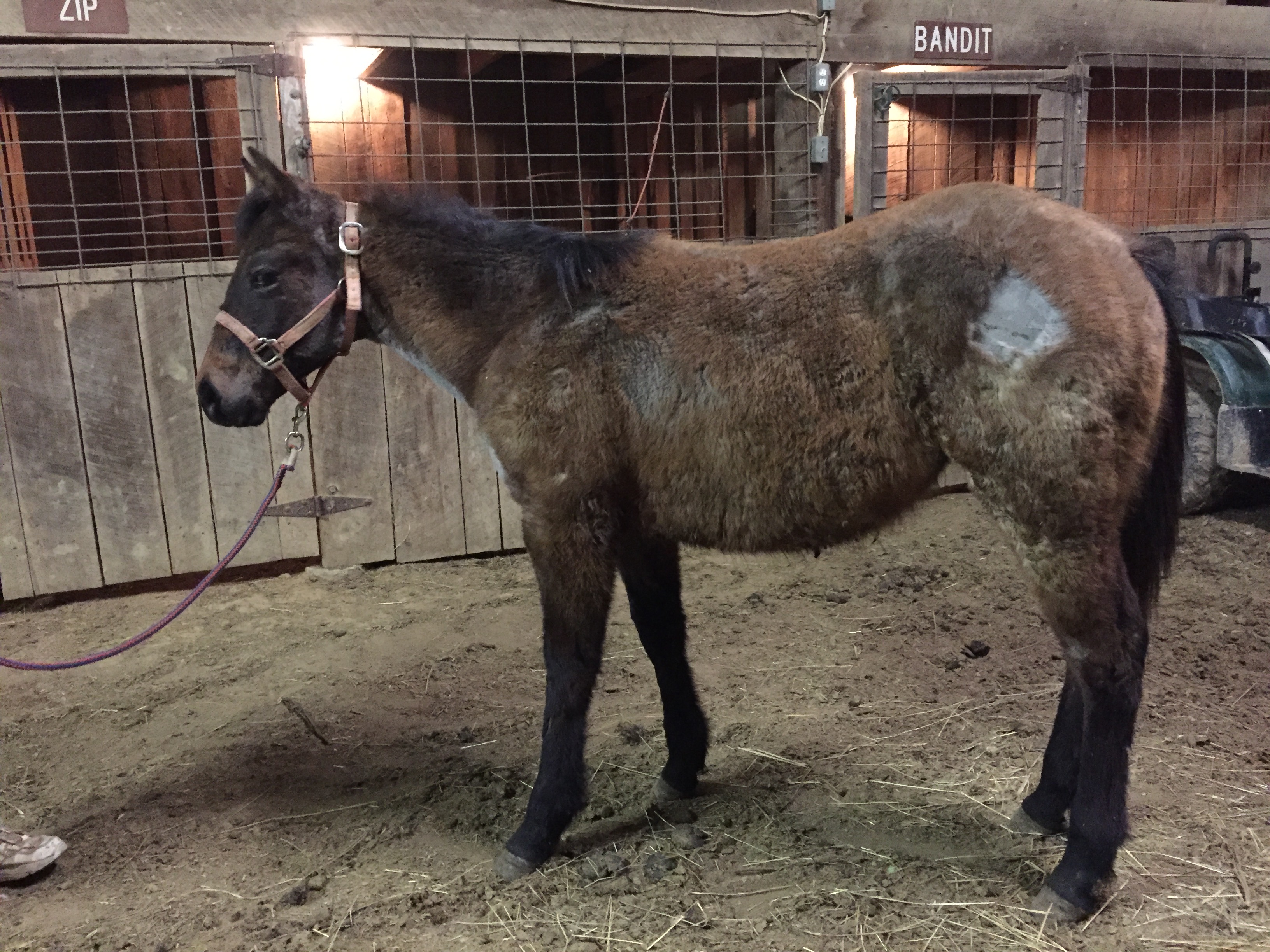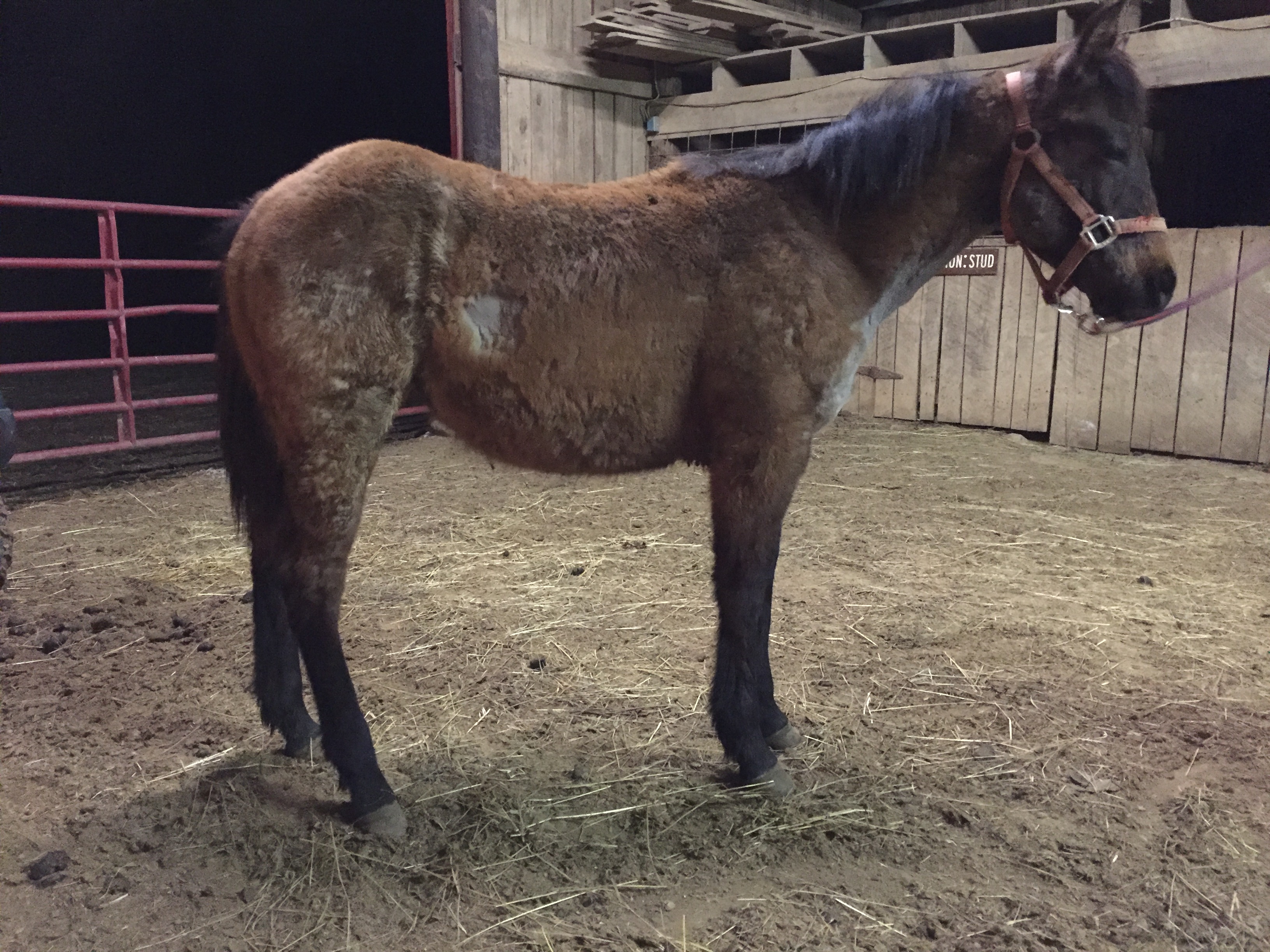 SOLD……AQHA bay roan filly, yearling. Born 6/1/15, 9 months old. Good roan color, nice size and thickness with bone for her age. Will mature 15 hands. Pedigree of krogs classy cowboy, grandsire on top. Hancock and Roan Ambose, own son of Blue Valentine on bottom. Her hip n chest were clipped for pics to show color once she looses winter hair. Nice prospect.