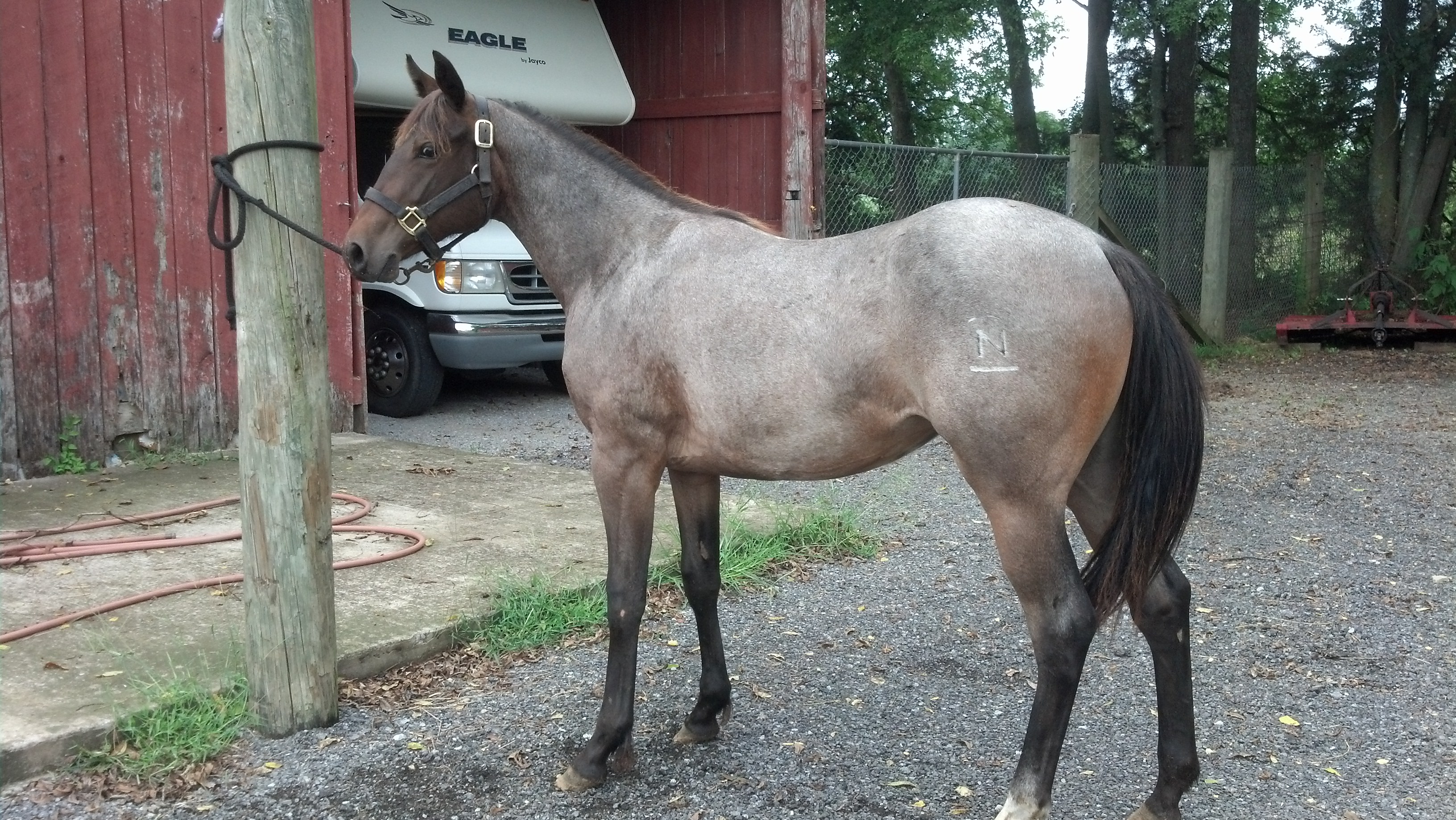 SOLD——–AQHA bay roan mare yearling, born 5/9/13. Sire is Val N Tine Blues and dam is Blue Zippo Lady.Double bred Blue Valentine thru own sons names Rowdy Blues Man and Roan Ambrose. Good minded filly with correct shape and color to boot. Deep in hip and chest, straight legs and a quick learner. Will be two come May and ready to taken in any direction under saddle. Ranch bred and raised in North Dakota. Branded on left hip. New coggins.
