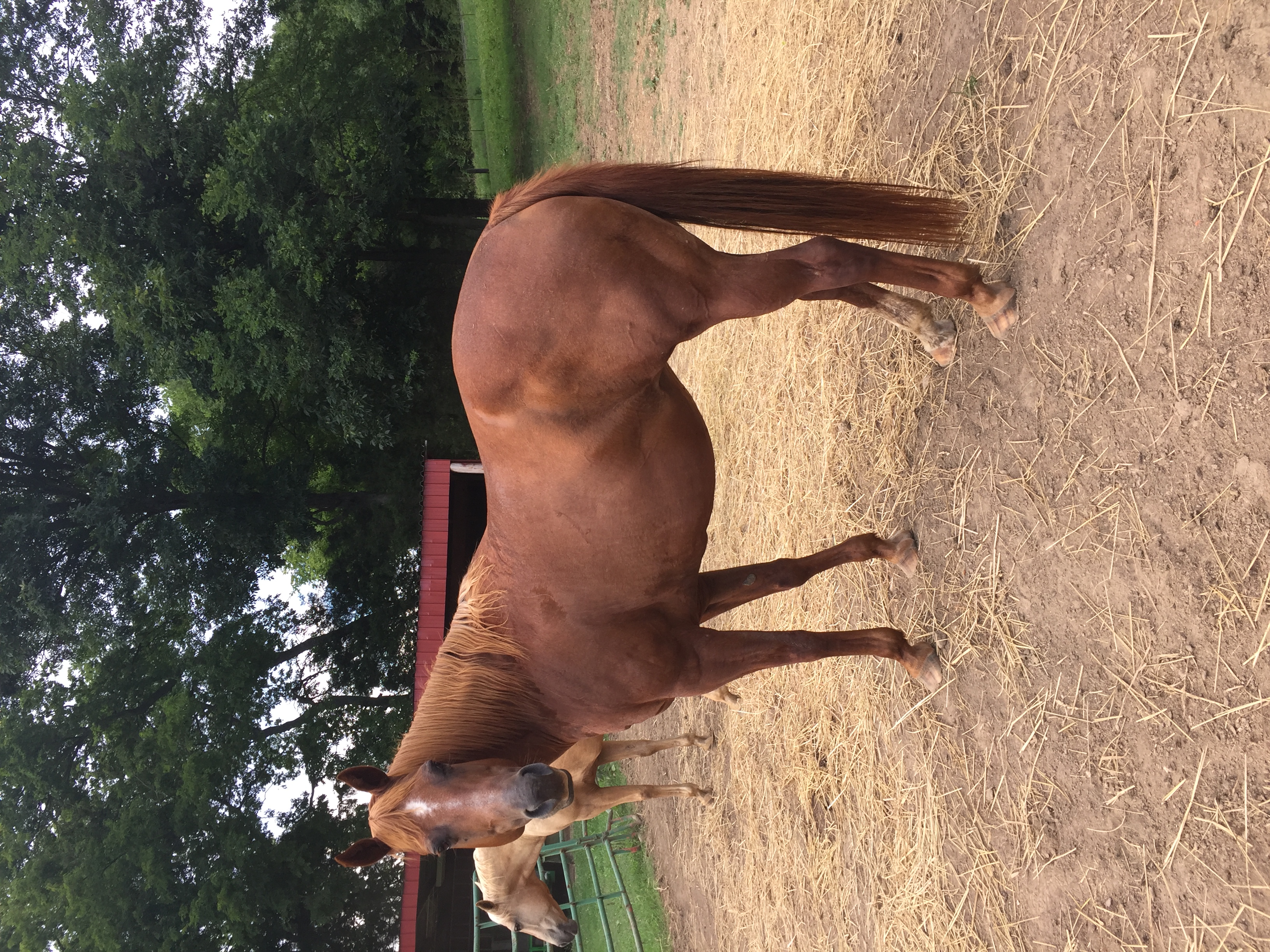 AQHA sorrel broodmare. 15 yr. 15 h and 1300lb. Super Gentle and easy to handle. Catch her anywhere you find her. Big milker and good mother. Not broke to ride. Selling for my cousin who has decided to cut back to riding horses only. Sells open and sound. On her papers are Genuine Doc(grandsire) and doc bar plus others champions such as Handy Nugget.