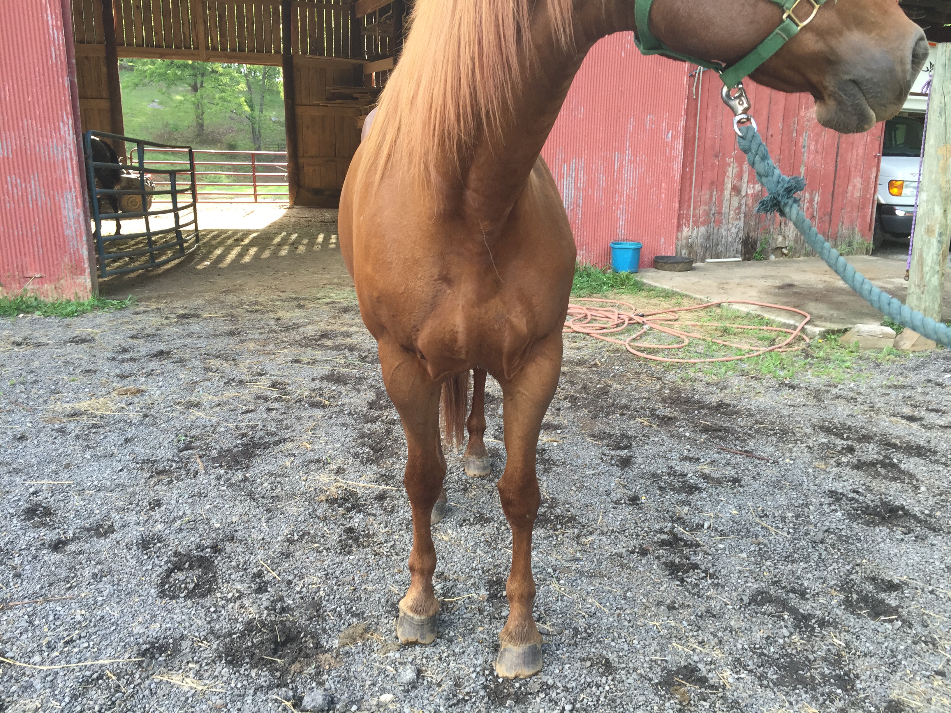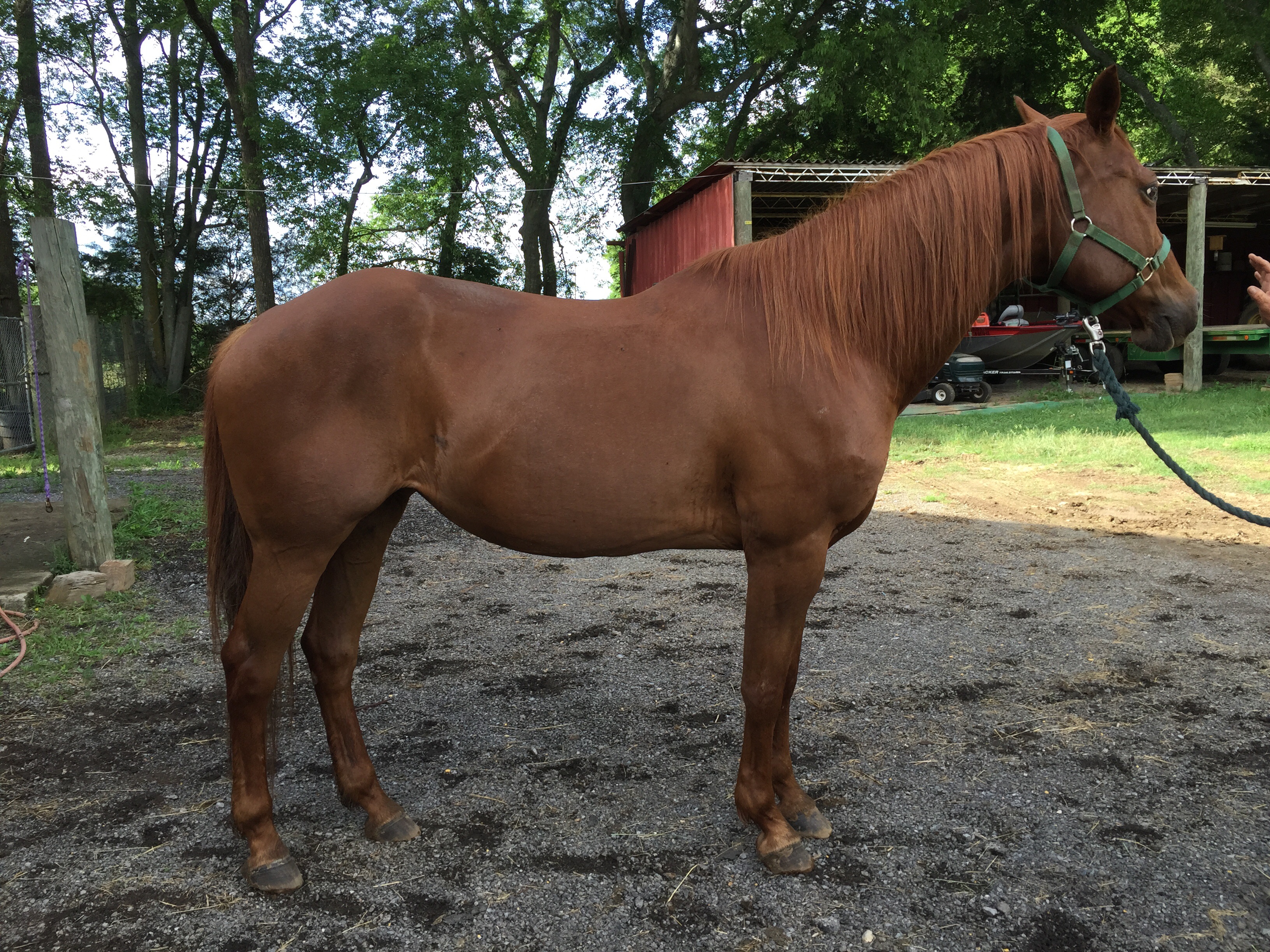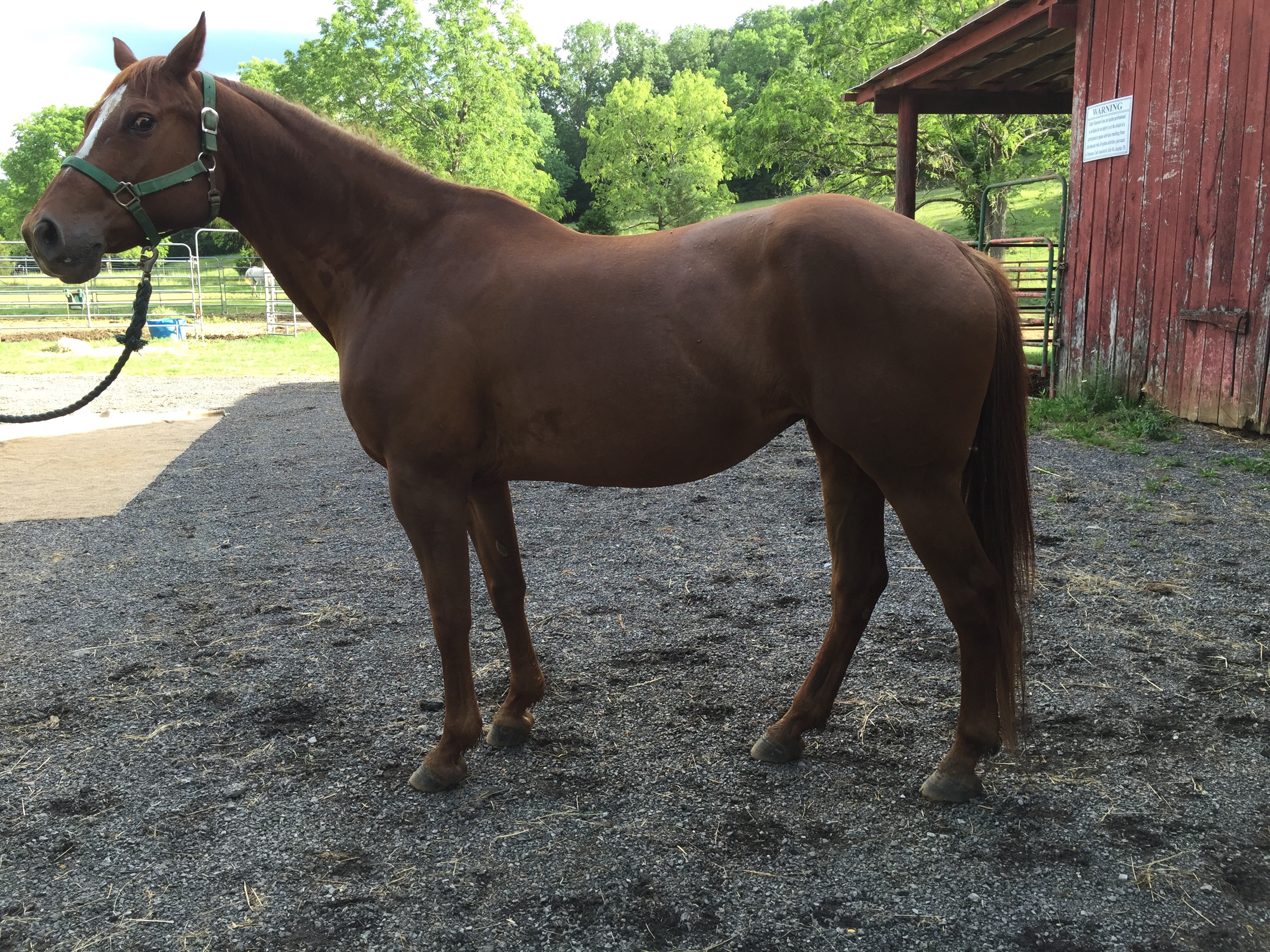 SOLD…..APHA sorrel solid mare with stripe. Stands 15.3 and well mannered. Easy to handle and catch. Breeds great. Trail horse as well. Rides great. Bred to Tuff for a May 2016 foal.