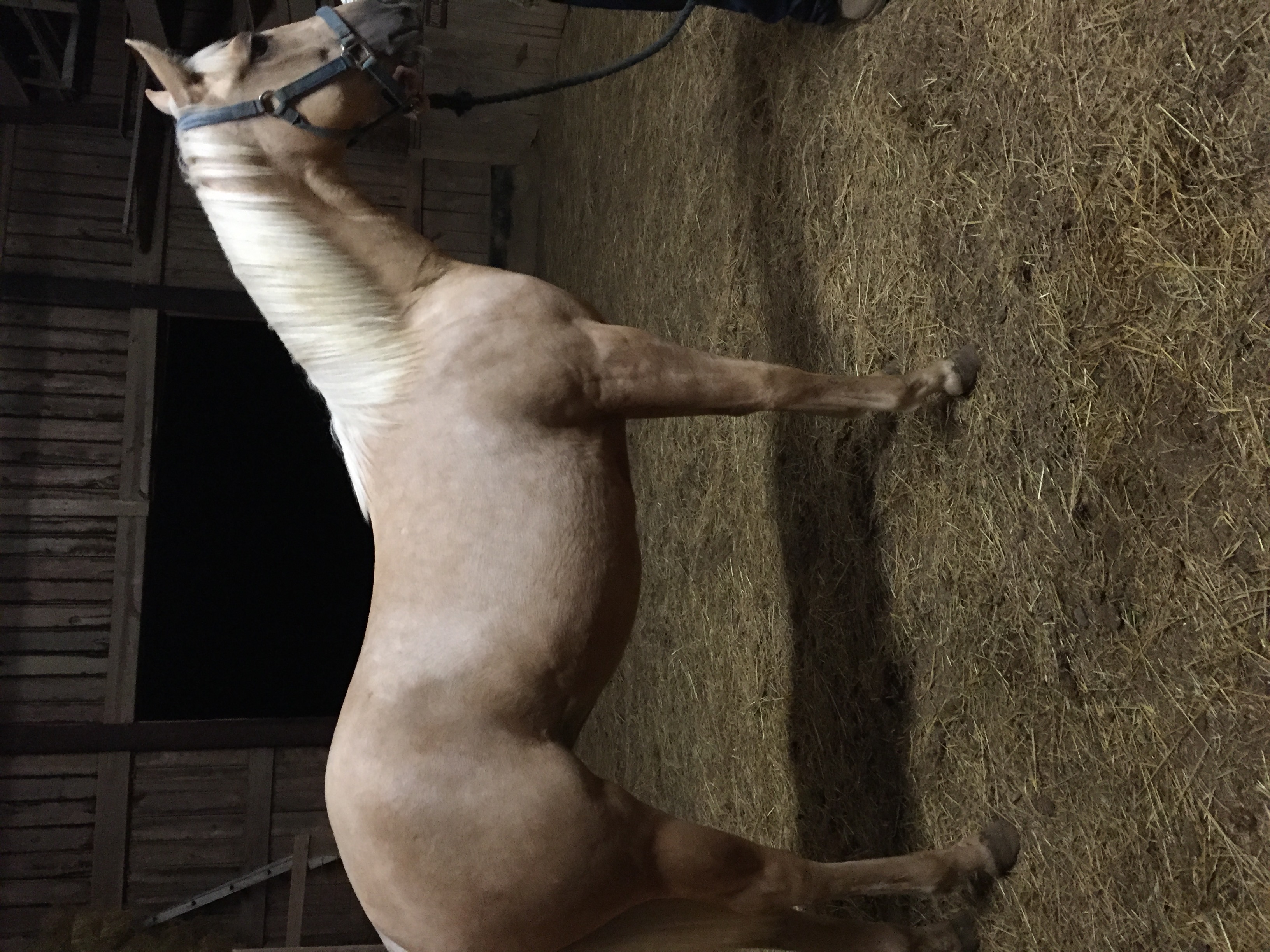 SOLD…….AQHA golden palomino mare, yearling Born May 2015. White mane and tail. Really nice filly, Big shoulder and hip. Will mature to 15.2-16h Take her in any direction. Outstanding prospect for barrels and roping. On papers, Driftwood Ike, Wilywood and Two Eyed Red Buck. Utd on worming, shots and coggins.