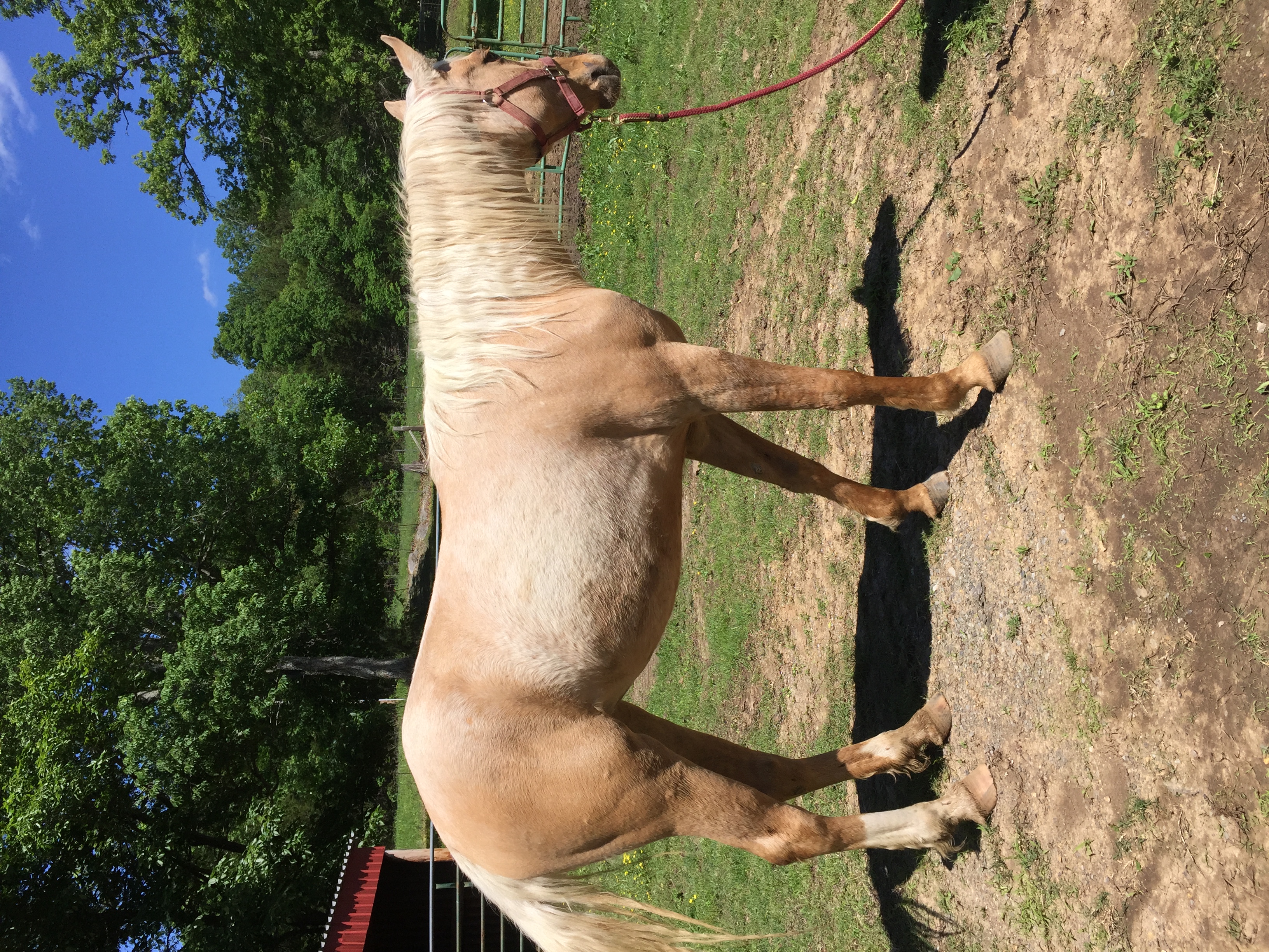 SOLD……..AQHA golden palomino dun mare, 2 yr old. Born April 2015. Has rear stocking and a rear sock above ankle. White mane and tail. Really nice filly, sweet, laid back and easy to handle. Big shoulder and hip. Will mature to 15 plus. Take her in any direction. Ready to start. Foundation King bred on top. Leads, easy to catch and loads. Utd on worming, shots and coggins.